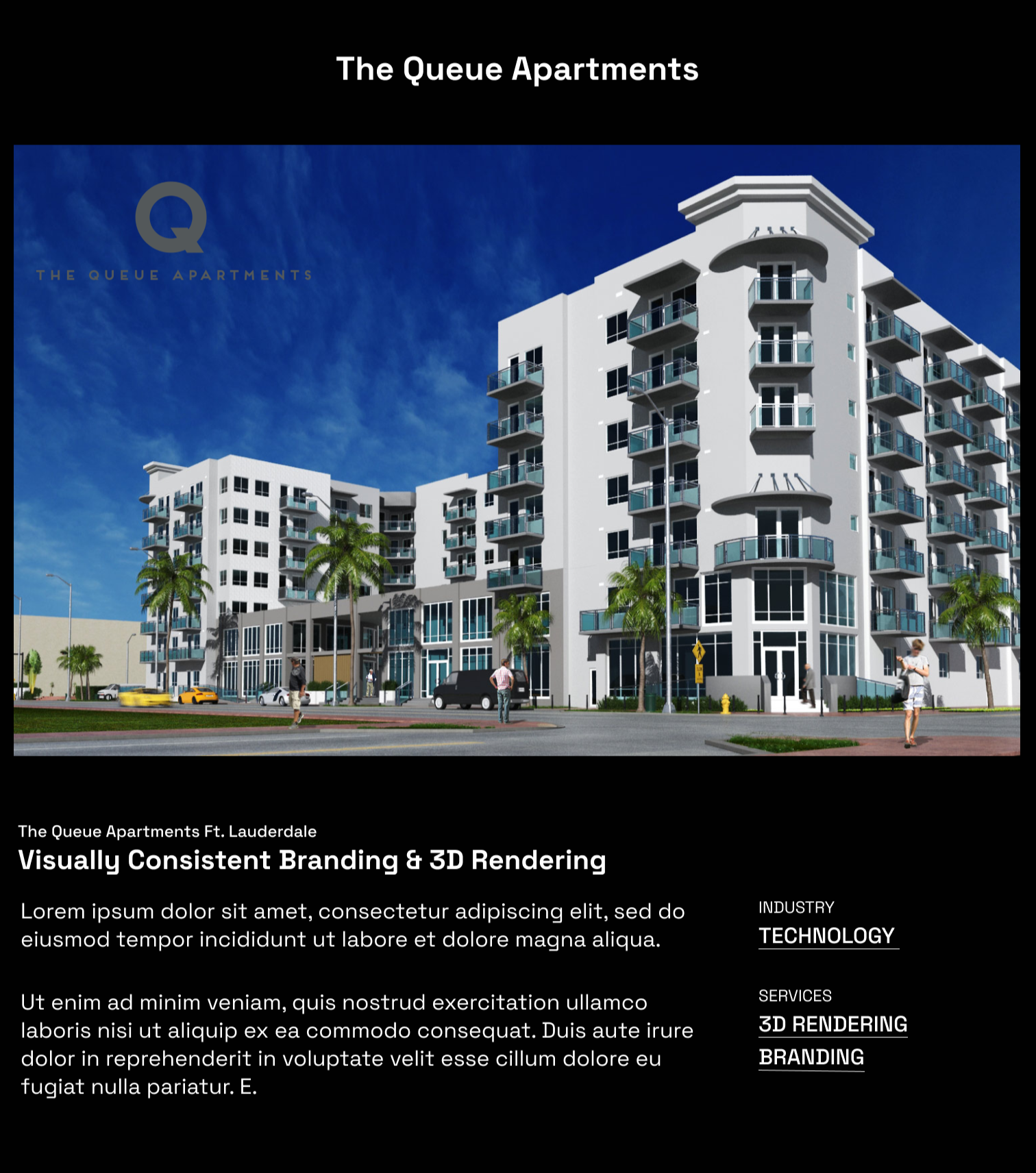 The Queue Apartments is a visually cohesive branding and digital presentation concept designed to showcase a modern residential development through immersive 3D rendering and clean layout design. The experience features: